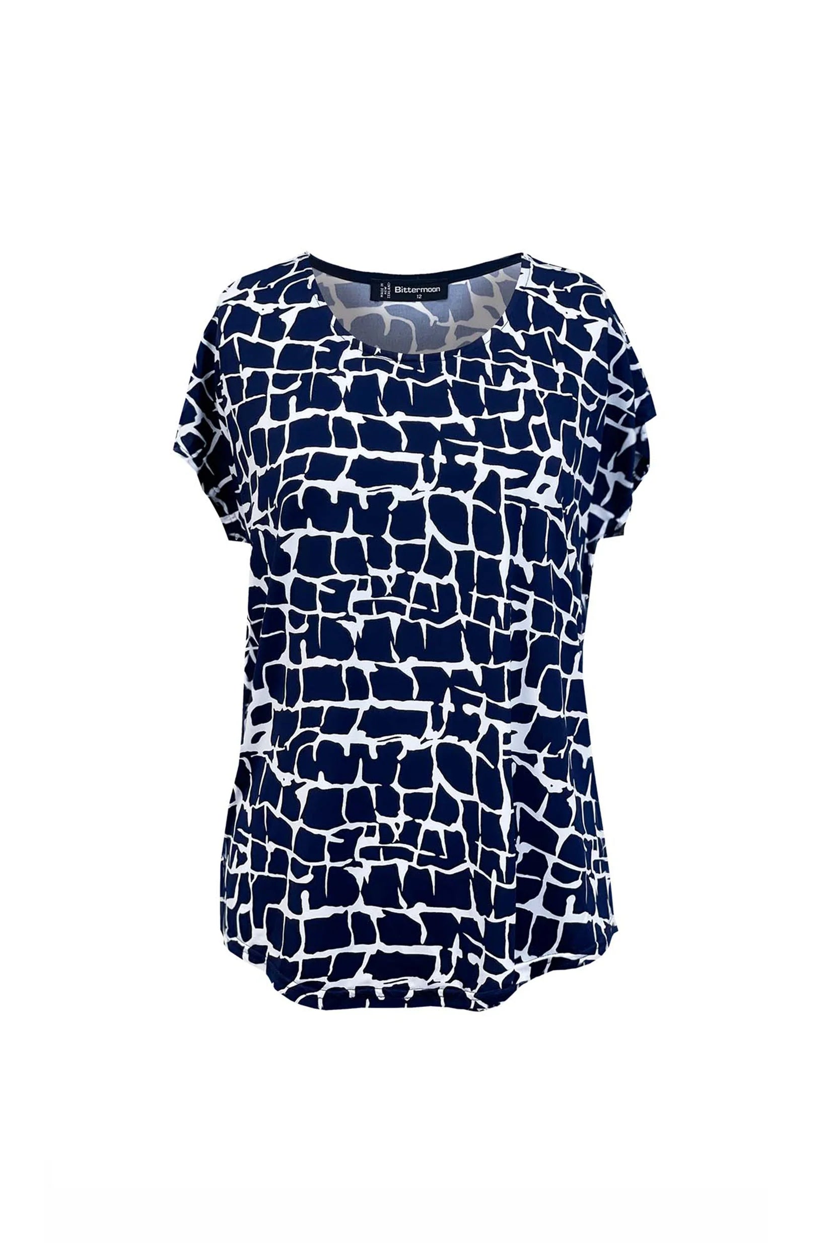 Easy-wear, bold flair. The Scoop Hem Top in Navy Abstract is a soft, floaty piece featuring an organic white-on-navy print that feels both graphic and grounded. Cut to flatter with a subtle overlay detail and curved hem, this is a versatile go-to that transitions from casual to polished.
