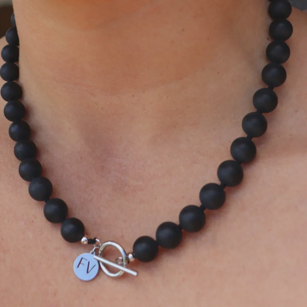 This Black Onyx Fob Necklace features the 10mm matte black onyx stones, making it a striking piece that is sure to make a statement.