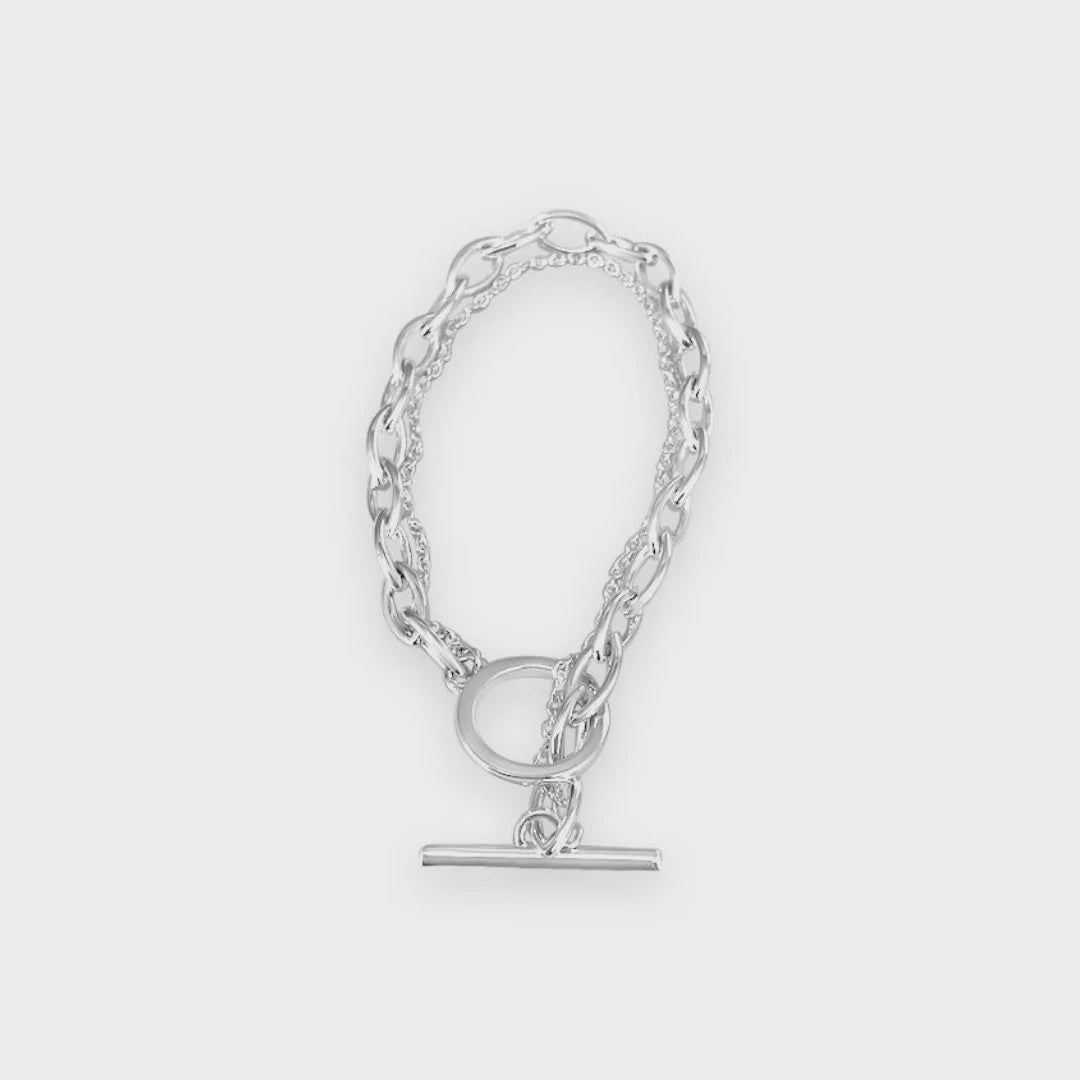 For a beautiful piece of jewellery to be treasured for years to come, choose this Demi bracelet. Crafted entirely from sterling silver, the combination of the two chains creates a modern and timeless piece of jewellery. One chain is a sterling silver wide oval link chain, paired with a sterling silver rolo chain. The total length of chain is 19cm, making this bracelet a standard size, fitting most wrists. The large fob allows for the bracelet to be taken on and off easily.