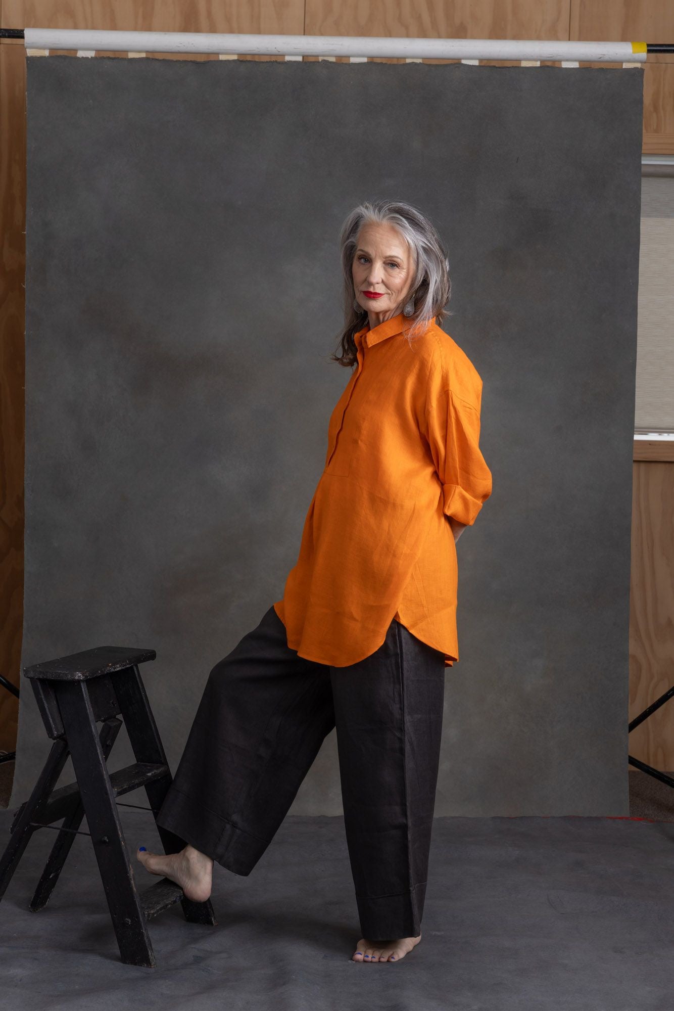 The back hem falls slightly longer than the front, and the shirt-tail finish creates a gentle side curve that flatters and lengthens the line of the body. Sleeves reach the wrist, though they also look lovely folded for a more casual, effortless look.