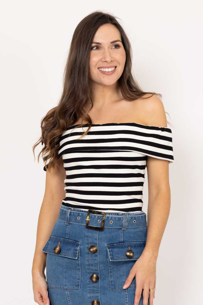 A pink and cream striped off the shoulder ribbed top.... to pair with your favourite, pants, shorts, skirts...perfect for any Summer Day....also available in black & white.