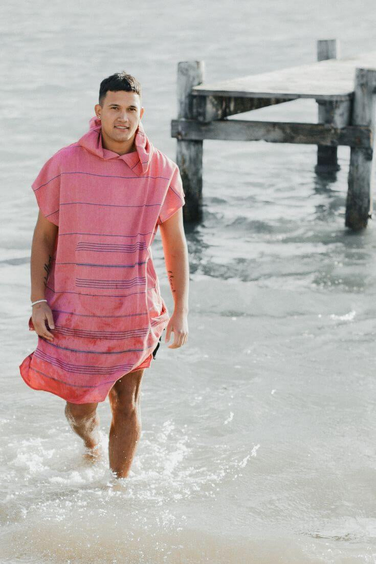 Need a portable changing room....A cozy, lightweight towel poncho to throw on and drive home in after the pools? This a red with grey stripe..