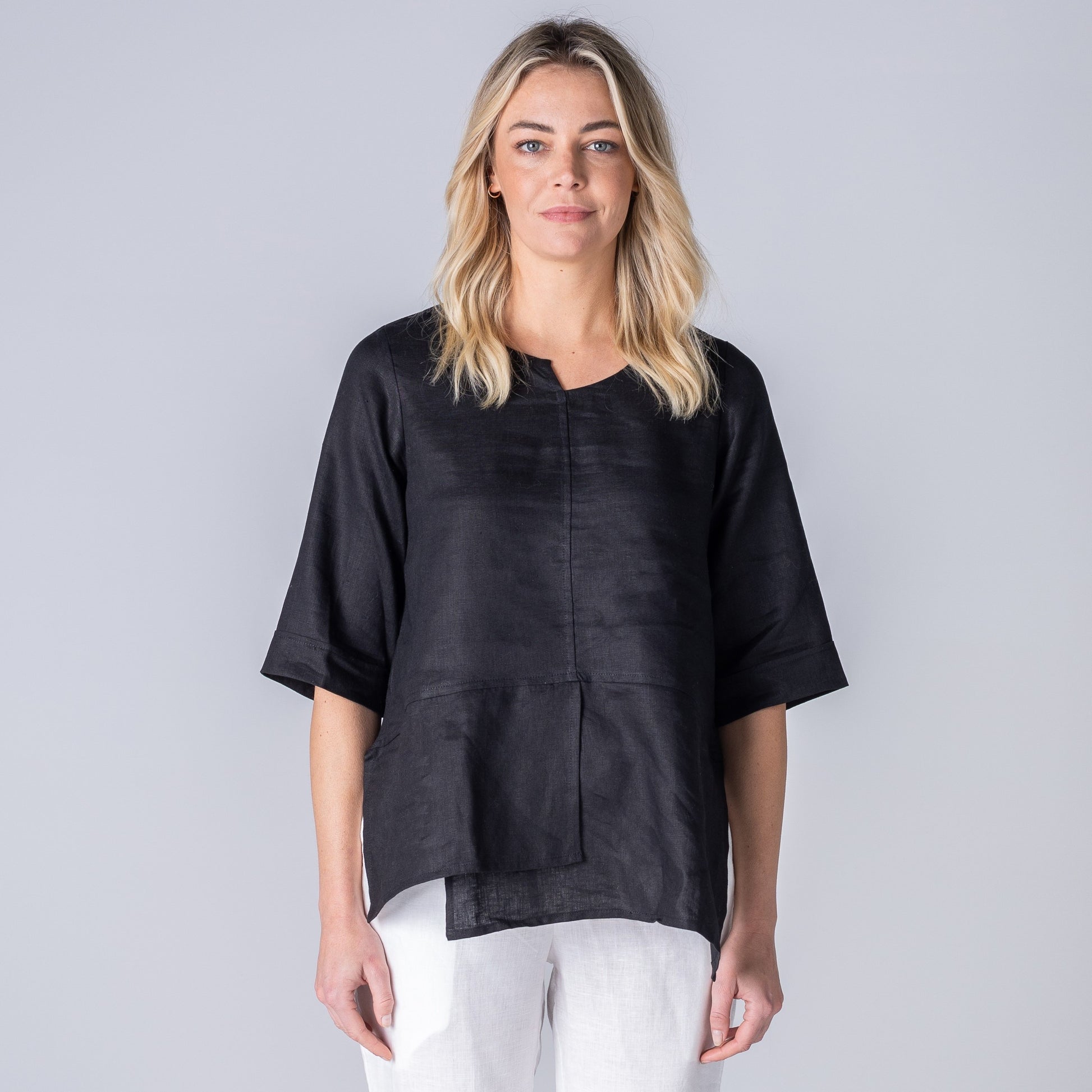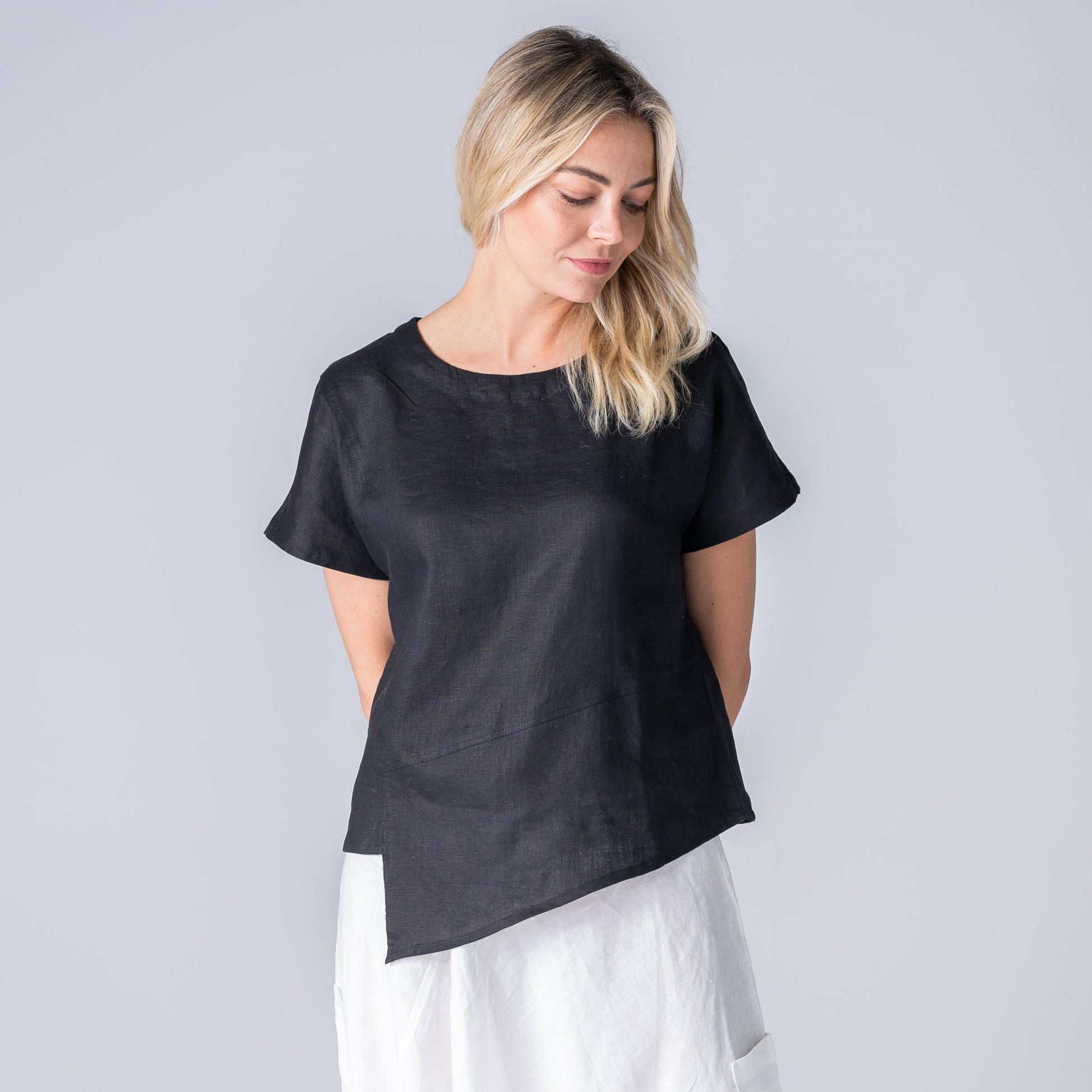 The Violin Top features an asymmetric cut and side split that create a beautifully flattering silhouette. Its refined lines bring a touch of modern artistry to classic tailoring — effortlessly elegant whether paired with a linen pants or a flowing skirt.